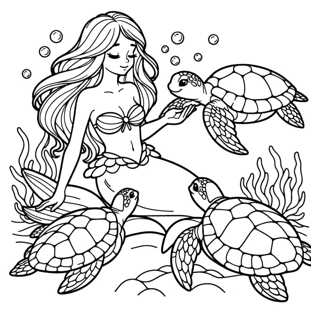 Mermaid And Sea Turtles Coloring Page